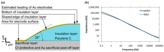 (a) The profile of the sloped edge of the insulation layer; (b) the impedance of the pMEA and the MEA with recessed electrodes.