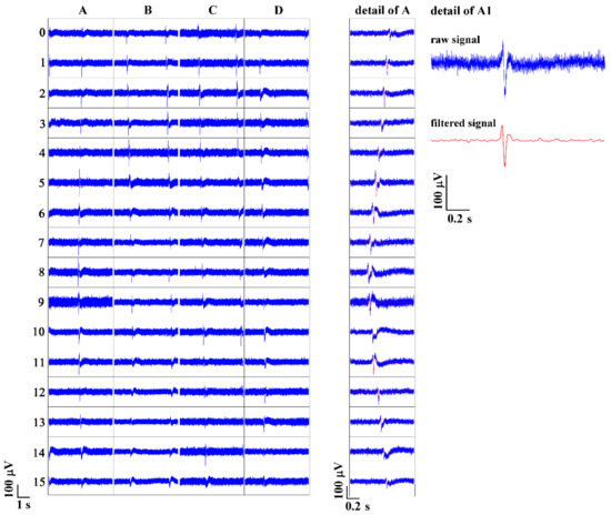 The scheme of expected alignment of HL-1 cells on the pMEA is shown in Figure 7. After 24 h, fully confluent HL-1 cells already formed gap junctions while they were still patterned in lines. The cells in lines presented their individual spontaneous and synchronous beating activity. Each line had an individual beat rate corresponding to an individual pace marker cell with the highest intrinsic frequency (Figure 8). For the raw signal, the average HL-1 peak from the upper amplitude to the lower amplitude was 160 ± 40 µV, and the noise was 11.3 ± 0.7 µV calculated as 2∙MAD (mean absolute deviation), while the signal-to-noise ratio (SNR) was 14.15. The raw noise calculated as RMS (root mean square) was 18 ± 1.2 µV, and SNR was 8.9. The raw signal was filtered by a low pass filter of 50 Hz and a high pass filter of 5 Hz. For the filtered signal, the average HL-1 peak was 101 ± 30 µV, and the noise was 1.6 ± 0.1 µV (2∙MAD), while the signal-to-noise ratio increased to 63.1. The filtered noise calculated as RMS (root mean square) was 3.2 ± 0.1 µV, and SNR was 31.6. Both MAD and RMS could be used for the determination of noise variability, while MAD suppresses the peaks in the signal more in comparison to RMS.