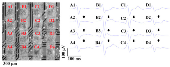 After measurement, HL-1 cells were fixed, stained, visualized, and measured, and the electrical activity was assigned in the figure to the corresponding electrodes (Figure 9). The propagation velocities of action potentials (APs) were defined as the distance between the detected thresholds of peaks. The direction of AP propagation was also individual for HL-1 cells patterned in lines. We analyzed AP propagation velocities in four clearly defined HL-1 cell columns, marked as A, B, C, and D in Figure 8. The velocities of the AP propagation were: A, 6.95 mm/s; B, 6.12 mm/s; C, 7.4 mm/s; D, 7.69 mm/s. In other studies, the reported AP propagation velocities were comparable: 4.6 mm/s [29] and 5−40 mm/s [30]. The study [17] presented a significantly higher velocity of 47–320 mm/s.