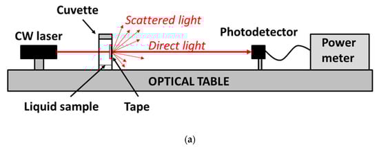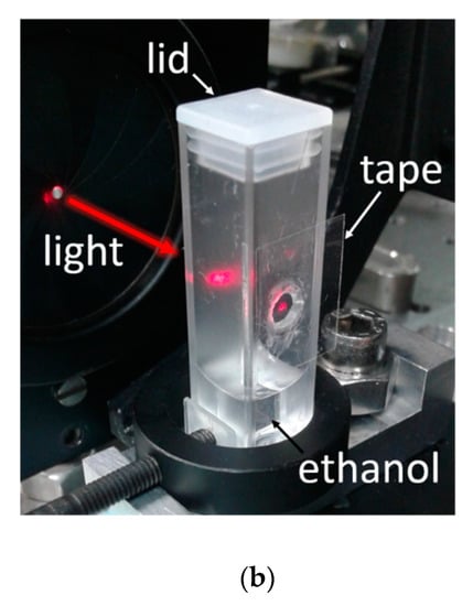The Scotch tape investigated was #550 Scotch® (3M, St. Paul, MN, USA), which is a general-purpose transparent adhesive tape consisting of a 20 μm thick synthetic acrylic adhesive material and a 30 μm thick bioriented polypropylene backing (from product data sheet). A transparent plastic cuvette (1 cm × 1 cm × 4.5 cm) was used as a vapor chamber for optically interrogating the adhesive side of a piece (approximately 1.5 cm × 2 cm) of Scotch tape, while exposed to vapors. For that, an ≈5 mm diameter hole was perforated on a sidewall of the cuvette, and then sealed on the outside by sticking the piece of Scotch tape under test on it. A 635 nm wavelength continuous wave (CW) laser beam (World StarTech TECRL-635) impinged the vapor-exposed adhesive tape region through the cuvette. The spot size illuminating the tape was approximately 2 mm in diameter. Directly transmitted light was collected by a photodetector (Newport 918D-SL-OD3), placed at 55 cm from the adhesive tape, and measured with a power meter (Newport 2931-C). Sensor response (i.e., transmitted light power) to vapor exposure was recorded by depositing 1 mL of liquid VOC inside the cuvette and closing it with a sealing lid to allow the evaporated VOC to interact with the adhesive tape material. Figure 1 shows a photograph of the cuvette–tape set-up, containing 1 mL of ethanol and being illuminated by the red laser beam. Sensor response to vapor exhaust was obtained by removing the cuvette lid. VOCs used in the experiments were ethanol, methanol, acetic acid, isopropanol, and ethanol–methanol mixtures. Spectral transmittance measurements were performed in the described cuvette set-up, by impinging white light from a fiber patch cable connected to a tungsten-halogen lamp into the vapor-exposed adhesive tape region, and collecting the transmitted light with another optical patch cable connected to a spectrometer (CCS200 Thorlabs). All measurements were carried out under laboratory environmental conditions: 21 °C temperature, and 20% relative humidity.