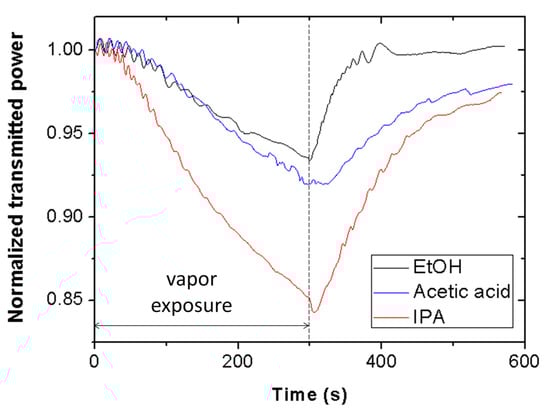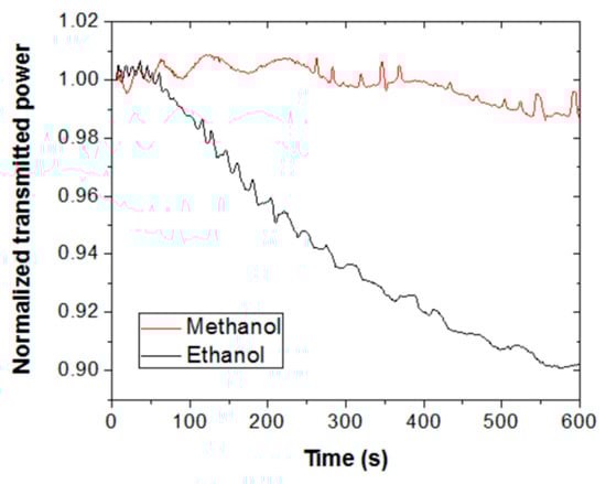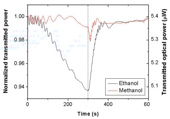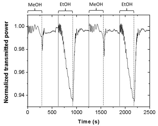 Besides the oscillation frequency, there is a clear and determining difference between the ethanol and methanol exposure signals: The former exhibits a pronounced decrease of the net transmitted power. This is an indication of high selectivity for ethanol vapor over methanol vapor. Such an effect cannot be attributed to a higher concentration of ethanol vapor in the chamber, since the evaporation rate of methanol is around twice greater than that of ethanol []. Sensor selectivity could then be due to a higher molecular affinity of the sensing material for ethanol, suggesting that the solubility parameter of the polymer is closer to that of ethanol (26 Mpa0.5 []) than that of methanol (29 Mpa0.5 []). A reason for the observed power decrease due to ethanol exposure might be attributed to an increment of light scattering produced by a swollen adhesive layer. The thicker the swollen layer, the larger the scattering effect, since the number of scattering centers (material and surface inhomogeneities) are expected to increase.