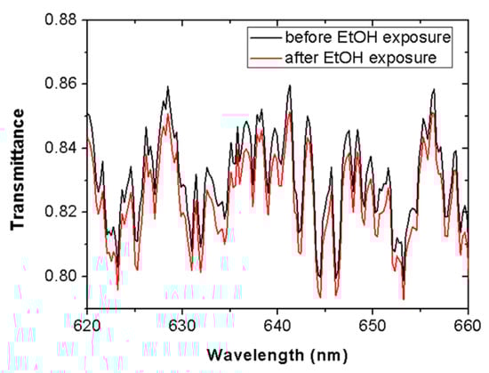Figure 3 shows the spectral transmittance in a wavelength range around 635 nm (620–660 nm) before (black line) and after (red line) 5 min of ethanol vapor contact. It was seen that all spectral components were attenuated by a similar factor after vapor exposure. This response dismisses material absorption as a possible cause for the measured light attenuation and, therefore, it points to light scattering as the responsible process.