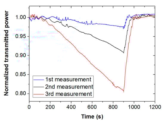 Figure 5 shows the sensor response for ethanol (black line) and methanol (red line) vapors for an exposure time of 10 min. Note that the saturation signal for ethanol is greater than that for methanol, supporting that the solubility parameter of the responsive polymer is closer to that of ethanol. Thus, saturation signal could be also used as a parameter to differentiate both alcohols. However, it should be mentioned that exposure times longer than 5 min (in particular, 10 min and 15 min) led to non-repetitive results for both ethanol and methanol. Figure 6 illustrates this fact by showing three consecutive measurements of methanol vapor for an exposure time of 15 min. It is seen for all measurements that when the tape is exposed for such a long time, light attenuation starts increasing with exposure time. All signals recover well when the vapor in the cuvette is removed. However, the second and third measures clearly deviate from the previous measurement during vapor exposure, exhibiting higher attenuation. This suggests some permanent or long-term modification of the Scotch tape material due to prolonged vapor contact, which prevented the device from being operated in saturated vapor conditions.