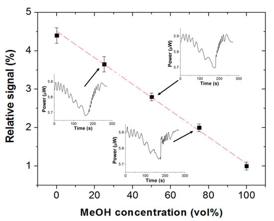 Sensor calibration was carried out by exposing the Scotch tape to vapors from ethanol–methanol liquid mixtures, ranging from pure ethanol to pure methanol. Both alcohols have similar natures (molecular structure and properties), and the corresponding binary mixture can be considered as nearly ideal []. That is, both solvents evaporate simultaneously at different rates and have little effect upon each other []. Figure 7 plots the relative signal of a Scotch tape vapor sensor, defined as [(P1 − P2)/P1] × 100, where P1 and P2 are the transmitted optical powers at 635 nm wavelength at the beginning and at the end, respectively, of the vapor exposure interval (3 min) as a function of the volume fraction of liquid methanol. The sensor exhibits a linear response (adjusted R2 = 0.995) from 0 vol% to 100 vol% methanol, with a sensitivity of S = −0.034%/(vol%). The limits of detection (LOD) of the sensor (calculated as LOD = |3σ/S|, where σ is the standard deviation of the baseline) equal 17.6 vol% liquid methanol and 8.8 vol% liquid ethanol. For the sake of comparison, LODs reported for enzymatic biosensors [] were 3 vol% liquid methanol and 23 vol% liquid ethanol, and 0.5–2.1 vol% liquid ethanol for fluorescence probes [].