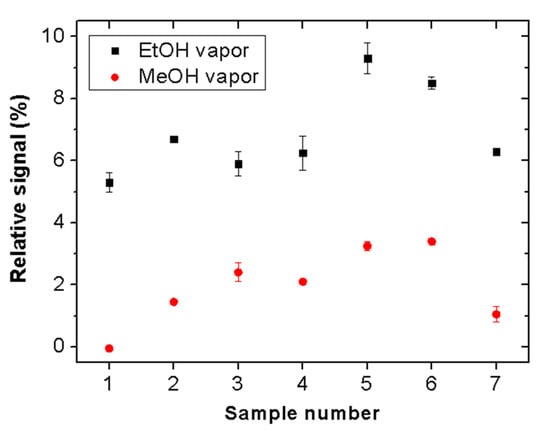 The reproducibility of the proposed sensor was tested by measuring the responses of seven different pieces of the considered Scotch tape. Figure 8 shows the relative sensor signals for ethanol and methanol (vapor exposure time = 5 min). All tested samples exhibit clear selectivity for ethanol vapor. The signal magnitudes vary in the ranges of 5% to 9% and 0% to 3.5% for ethanol and methanol, respectively. These variations may be attributed to thickness and morphological inhomogeneities of the adhesive material of the tape.