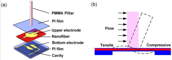 As shown in Figure 1b, when an external flow passes parallel to the sensor surface, a drag force is imparted to the pillar. Due to the rigid connection between the pillar and the PI film, the bending moment is transferred to the bottom membrane inducing the piezoelectric output.