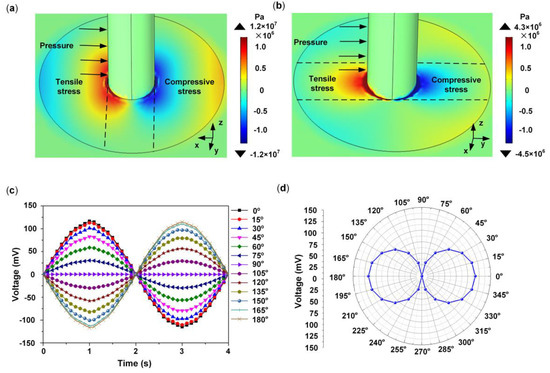 Distribution of stress in the x direction when pressure is at 0° (a) and at 90° (b); (c) Relationship between signal outputs and directions of pressure in the time domain; (d) Directivity curve of the HAVS device in polar coordinates.