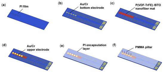 The fabrication process of the HAVS device is illustrated in Figure 3. A commercially available 50-μm-thick PI film was etched to form 30-μm-deep cavities by reactive ion etching with a stencil mask (Figure 3a). After treatment with O2 plasma for 3 min, an Au/Cr (160 nm/40 nm) layer was sputtered on the PI film by magnetron sputtering with a stencil mask to form the bottom electrodes of the sensor (Figure 3b). The P(VDF-TrFE)/BTO nanofiber mat was fabricated by a far-field electrospinning method and the detailed electrospinning process was demonstrated in our previous work [33]. The thickness of the nanofiber mat was 40 μm, which was well controlled by adjusting the electrospinning time. The nanofiber mat was annealed in an oven at 135 °C for 2 h. For the poling process, the fiber was sandwiched in PET films with Cu tapes as the electrodes. The device was immersed in silicone oil under an electric field of 8.4 V/μm for 1 h at 80 °C with the same field applied in the cooling run. Schematic diagram of the polarization device is shown in Figure S3.