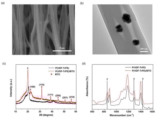 Characterization of the P(VDF-TrFE)/BTO nanofibers. (a) SEM image of the P(VDF-TrFE)/BTO nanofiber mat; (b) TEM image of a single nanofiber; (c) XRD and (d) FTIR spectroscopy results for the nanofiber mat.
