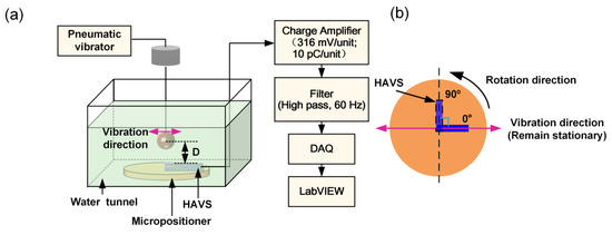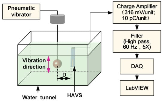The velocity response of the HAVS was characterized in a water tunnel of dimensions 0.7 × 0.35 × 0.4 m3. The water tunnel was filled with 25-cm-deep water. Schematic diagram of the experimental setup is shown in Figure 6. A hydrodynamic stimulus was generated by a vibrating sphere with a diameter of 15 mm, known as the dipole source, which has been commonly used in studies on artificial LLS [14,31]. The dipole was driven by a pneumatic vibrator through a stainless steel rod, and the vibration amplitude was 1.1 mm. The vibration frequency of the dipole was set at 80 ± 2 Hz in this experiment, and could be adjusted manually. The output signal of the sensor was amplified by a charge amplifier (NEXUS Conditioning Amplifier-2692, Brüel & Kjær, Denmark). The signal was filtered by an adjustable filter (3624, NF Electronic Instruments, USA) with a high pass of 60 Hz and an amplification gain of 5. A data acquisition card (USB-4711, Advantech, China) with a sampling rate of 2000 Hz was used to record the output. The unamplified charge outputs (peak values) of the sensor were employed for statistical analysis.