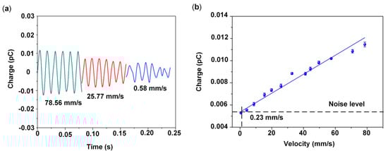 (a) Charge output under flow velocities of 78.56, 25.77, and 0.58 mm/s; (b) Relationship between charge output and velocity.