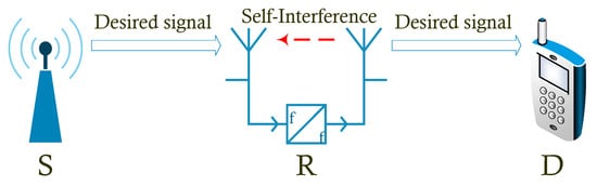 Meanwhile, the multiple-input multiple-output (MIMO) transmission is another solution that can also achieve high capacity and better performance over the SISO systems []. However, the hardware of the MIMO system is more complex, that is, more radio frequency (RF) chains, as both transmitter and receiver user multiple antennas. The MIMO receiver also requires a high-complexity detector to deal with the inter-channel interference (ICI) due to simultaneous transmissions on the same frequency from different antennas. In that context, SM can tackle these issues correctly as it activates only one transmit antenna for transmission and requires only low-complexity iterative maximal-ratio combining (MRC) at the receiver for signal estimation [,,,]. Therefore, the combined SM and FD system achieves higher spectral efficiency while reducing the complexity requirement at the transceiver, particularly of the relay node.