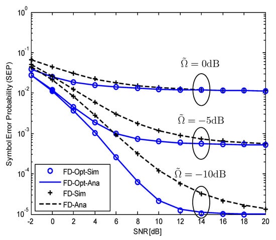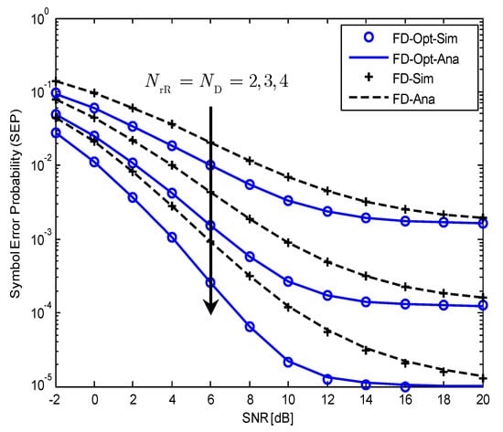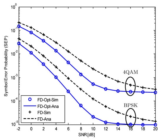 Figure 2 plots the SEP of the considered SM-MIMO-FD relay system versus the SNR in dB for two modulation schemes, that is, BPSK (, ) and 4-QAM (, ). We should remind that a and b are constants, which depend on the types modulation scheme. These values for each type of modulation are given in Table 6.1 of Reference []. As shown in Figure 2, similar patterns of SEPs can be observed in both BPSK and 4-QAM modulation schemes. However, the system with 4-QAM modulation has higher SEP than the system with BPSK modulation. Moreover, the benefit of optimization is also reduced as the modulation order increases. Therefore, although our analysis method can be applied for all modulation types, we use the BPSK modulation in the following figures to clearly show the advantage of our proposed optimization algorithm in reducing the SEP of the considered SM-MIMO-FD relay system.