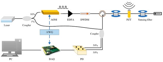 The experimental set-up of the Ф-OTDR system is shown in Figure 1. The benefit of the optical path structure is that it is simple and no additional devices are added. The ultra-narrow linewidth laser is divided into two paths with a 99:1 coupler. The 1% light is regarded as a local oscillator light, and the 99% light is modulated into pulsed light by an acousto-optic modulator (AOM). The pulsed light is injected into an erbium-doped fiber amplifier (EDFA) to amplify the light power. Then, the pulsed light goes through a dense wavelength division multiplexer (DWDM), which can filter out the light of other wavelengths except 1550 nm, and then is launched into the sensing fiber via an optical circulator (OC). A piezoelectric transducer (PZT) is used to simulate the regular vibration signal. Afterwards, the RBS light, which is the mutual interference result of numerous scatters within the pulse duration, is returned. The local oscillator light and RBS light are fully mixed by a 2 × 2 coupler. The beat signal is produced in the bandwidth-limited photodetector (PD). Then, the beat signal is transformed into the electric signal. Eventually, the signal is acquired by the data acquisition card (DAQ) and processed on the host computer. The modulation of the pulse light and the trigger of the DAQ are realized by an arbitrary waveform generator.