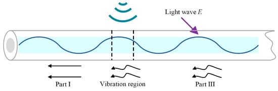 When the external perturbance is exerted on the sensing fiber, the refractive index of the fiber will change and the light phase will be modulated. Part I is, thereby, not affected, while part III experiences double phase modulation. The double phase modulation is the accumulation of the distributed phase change in part III and is denoted Δϕ. Therefore, the light field is described by Equation (4) when the external disturbance occurs.