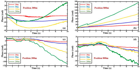 In order to demonstrate that the phase drift is related to system factors in the condition of isolating ambient temperature and strain, the experiments were carried out and some measures were taken. Better soundproof protection for optical fiber was implemented and the experiments were completed in a room with constant temperature of 25 °C. The experimental justification results are shown in Figure 4 when the selected positions are 300 m and 800 m. Both of them were in a vibration-free environment. The phase traces are displayed when Δs was 20 m, 50 m, 100 m, and 200 m. Figure 4a,b are from the first record. It can be seen that the phase drift still exists when the influences of the ambient temperature and strain have been avoided. Figure 4c,d are from the second record. These two figures also reflect the same rule. From Figure 4, it can be illustrated that the phase drift is related to system factors. When the Δs increases from 20 m to 200 m, the curve fluctuates and the phase drift becomes more deteriorating. This proves that the phase drift increases with Δs, which corresponds to Equation (13).