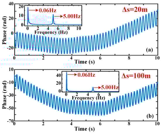 Figure 5a,b expresses the phase change when the vibration is a sinusoidal signal of 5 Hz and 10 Vpp. By fast Fourier transform (FFT) of the phase curve, it can be seen that there is not only a 5 Hz vibration signal but also a 0.06 Hz low-frequency component. This low-frequency component is known as the baseline. It has the feature of slow variation and drives the real phase curve to float up and down as a whole. This further proves the existence of low-frequency phase drift. In Figure 5a, the amplitudes of the actual phase and phase drift are about 18.34 dB and 10.91 dB. In Figure 5b, the amplitudes of the actual phase and phase drift are approximately 46.38 dB and 10.69 dB. By comparing Figure 5a with Figure 5b, it can be concluded that the phase drift increases with Δs, but the amplitude of phase induced by external disturbance is roughly the same.