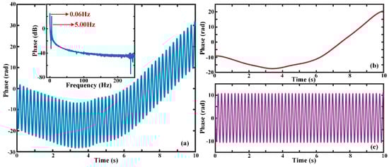 Figure 6a indicates the phase change after demodulation when the vibration is a sinusoidal signal with frequency of 5 Hz and intensity of 10 VPP, and the Δs is 20 m. It can be seen that the whole fluctuation of the curve is large and reaches about 38.04 rad. By FFT analysis of the phase signal, there was not only a frequency component of 5 Hz caused by external perturbation but also a low-frequency residual wave of 0.06 Hz. Figure 6b,c were obtained when the original phase after demodulation was decomposed and processed by the EMD method.