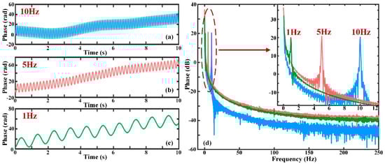 The actual phase variation after phase drift elimination and frequency spectrum (a) when the vibration is a sinusoidal signal with frequency of 10 Hz; (b) when the vibration is a sinusoidal signal with frequency of 5 Hz; (c) when the vibration is a sinusoidal signal with frequency of 1 Hz; (d) the FFT analysis results of the actual phase signals when the vibration frequencies are 10 Hz, 5 Hz, and 1 Hz.