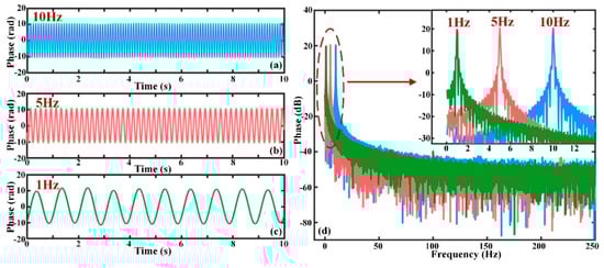 The phase change results after using the EMD algorithm are shown in Figure 8a–c. Figure 8a–c indicate the phase signals without phase drift when the external vibrations are sinusoidal waves with frequencies of 10 Hz, 5 Hz, and 1 Hz, respectively. By comparing Figure 7a and Figure 8a, it can be seen that the 10 Hz sinusoidal wave was well restored and the phase drift was successfully eliminated. These comparison results were also seen for the other frequency components of 5 Hz and 1 Hz. From Figure 8d, the amplitude of the actual phase signal was not affected after the low-frequency component was removed. The feasibility and validity of phase drift elimination using the EMD algorithm is, thus, verified when the external disturbance is a sinusoidal signal with different frequencies.