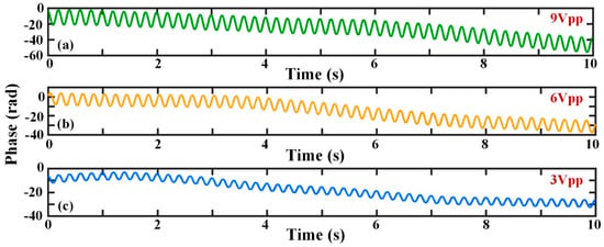 Phase variation after demodulation in the different vibration intensities; (a) when the vibration intensity is 9 Vpp; (b) when the vibration intensity is 6 Vpp; (c) when the vibration intensity is 3 Vpp.