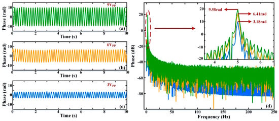 Phase variation after phase drift elimination and frequency spectrum; (a) when the vibration intensity is 9 Vpp; (b) when the vibration intensity is 6 Vpp; (c) when the vibration intensity is 3 Vpp; (d) the FFT analysis results of the actual phase signal when the vibration intensities are 9 Vpp, 6 Vpp, and 3 Vpp.