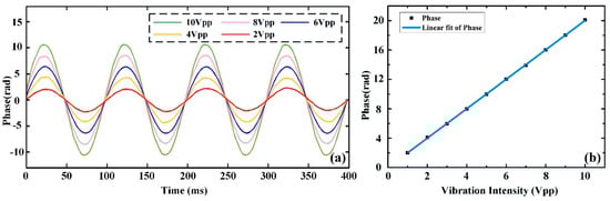 (a) Phase variation after phase drift elimination when the vibration intensities are 10 Vpp, 8 Vpp, 6 Vpp, 4 Vpp, and 2 Vpp; (b) a linear fit curve of actual phase variation.