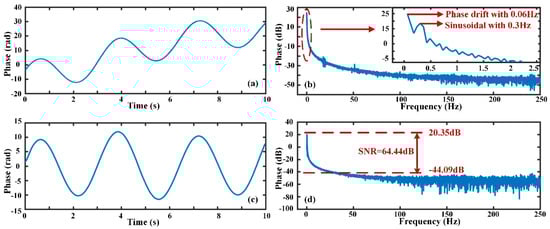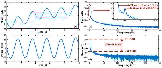 To test the feasibility and effectiveness of the EMD method in the case of low-frequency external perturbance at the sub-Hz level, sinusoidal signals with different low frequencies were imposed on the PZT. Figure 12 expresses the phase change curves before and after phase drift was eliminated when the exerted vibration was a sinusoidal signal with frequency of 0.5 Hz, intensity of 10 Vpp and the Δs value was equal to 20 m. In Figure 12a,b, the phase signal after demodulation includes a sinusoidal signal of 0.5 Hz and a low-frequency component of 0.06 Hz. By executing the EMD algorithm, the phase drift was extracted and eliminated, as shown in Figure 12c,d. From the result after FFT analysis, the amplitude of the sinusoidal signal with frequency 0.5 Hz was approximately 20.85 dB, and the ambient noise level was about −34.73 dB (0.0183 rad/√0.5 Hz = 0.026 rad/√Hz), so the SNR of the phase signal was 55.58 dB.