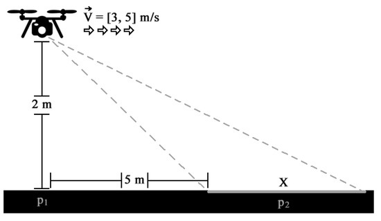 In this scenario, the UAV flies at approximately 2 m above ground level while the camera focuses on an area 5 m ahead of the UAV position. The proposed system has been adjusted to work with this camera position to achieve the correct value of the reflection coefficient. In