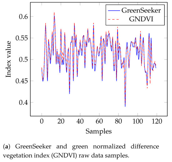 Figure 12, in which Figure fig:samplesOfNDVIa presents the raw measurements and Figure fig:samplesOfNDVIb presents the difference between the values measured by the GNDVI and the GreenSeeker.
