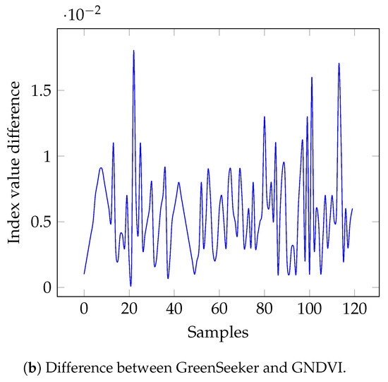 Figure 12a shows that the two graphs almost overlap, highlighting the small difference between the GreenSeeker and the GNDVI results. The average difference between the GNDVI and GreenSeeker NDVI values was 0.0055 with a standard deviation of ±0.0033. The relative root-mean-square error (rRMSE) between the GNDVI and GreenSeeker NDVI values was