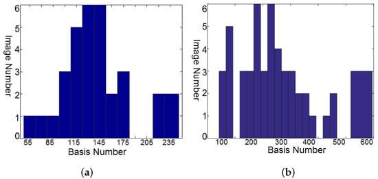 The histogram of the dictionary number of all images in the CAVEand Harvard databases. (a) Cavedataset; (b) Harvard dataset.