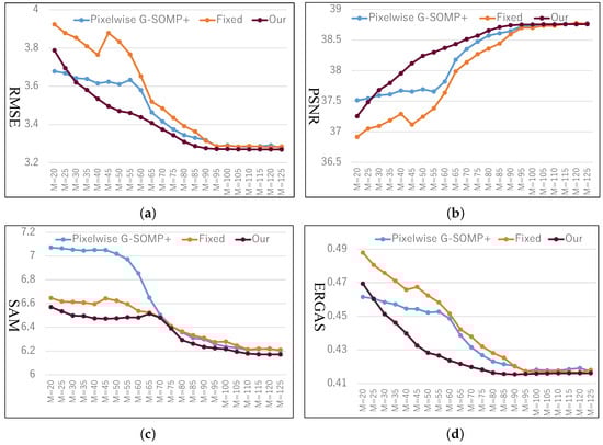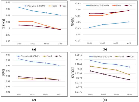 Quantitative compared results with the pixel-wise generalized simultaneous orthogonal matching pursuit (G-SOMP+) method, the spectral representation of the fixed number, and the data guided number of the dictionary atoms (our proposed method) under different hyper-parameters M on the CAVE dataset. (a) RMSE; (b) PSNR; (c) spectral angle mapper (SAM); (d) relative dimensionless global error in synthesis (ERGAS).