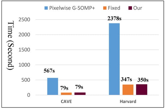 As introduced in Section 4.1, we trained the HS dictionary from the observed LR-HS image for the under-studied scene instead of learning the common dictionary for different scenes. The histogram of the dictionary number of all images in the CAVE and Harvard databases is shown in Figure 2a,b, respectively, which manifested a much smaller number of learned bases than the raw spectral numbers (256 for the images in CAVE and 1024 in Harvard). As we know that the computational cost of the sparse coding procedure in Equation (5) is proportional to the basis number used, thus the calculating time of the sparse coding would be greatly reduced for the images in both the CAVE and Harvard datasets. The online dictionary learning (denoted as OLD) took much less than s, which is much less than the computational time of the sparse coding. Since our proposed method explored the spectral representation with the pixel-wise sparsity constraint, we modified the G-SOMP+ [13] method for selecting the dictionary atom of each pixel separately instead of the whole patch for fair comparison, called pixel-wise G-SOMP+, where the hyper-parameter M was the predefined number of the simultaneously selected dictionary atoms. We also fixed the number of used dictionary atoms for the pixel spectral representation and adaptively adjusted the used atom number according to our proposed data guided sparsity map. We conducted experiments on all images in the CAVE and Harvard datasets and calculated the average RMSE, PSNR, SAM, and ERGAS for comparison. The compared quantitative results with different hyper-parameters M are shown in Figure 3 and Figure 4 for the CAVE and Harvard datasets, respectively. From Figure 3, it can be seen that the pixel-wise G-SOMP+ could achieve better performance than the fixed number of the used dictionary atoms for spectral representation (denoted “Fixed”), and our proposed method with data guided sparsity could further improve the performance for most hyper-parameters and all quantitative metrics in the CAVE dataset. For the Harvard dataset, the “Fixed” number of the used dictionary atoms for spectral representation provided better results than the G-SOMP+ method, and our proposed method could further improve the performance, especially for the ERGAS metric. In addition, we provide the computational time of the pixel-wise G-SOMP+, the spectral representation with the fixed number, and the data guided number of the dictionary atoms in Figure 5. Figure 5 manifests that our method had comparable computational cost with the fixed number of dictionary atoms, but about seven times faster than the pixel-wise G-SOMP+ method.
