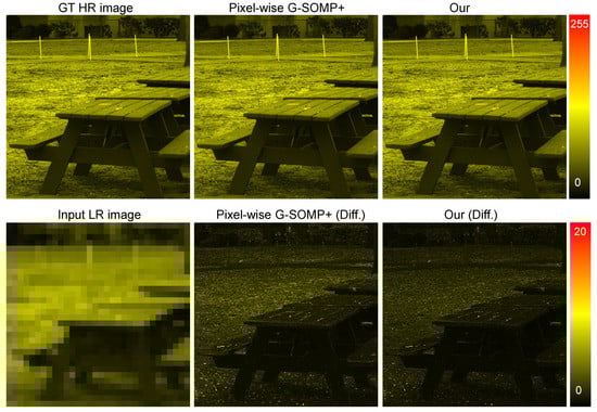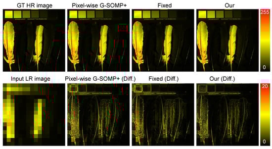 From Table 1 and Table 2, we observe that for all error metrics, our approach achieved better than or comparable performance as the state-of-the-art methods. It should be noted that most existing methods excepting the G-SOMP+ approach [13] simultaneously (coupled) minimized the reconstruction errors of the available HR-RGB and LR-HS images. Since we attempted to validate the efficiency of the adaptive sparsity strategy for different samples, our proposed method simply optimized the sparse representation with the available HR-RGB image only like in the G-SOMP+ approach [13] and can be extended to any other coupled method for more accurate performance. Figure 6 shows an example of the recovered HR-HS images (the image of the 20th band) with the pixel-wise G-SOMP+ method, the fixed, and the adaptive basis number and the corresponding difference image between the ground truth and the recovered images in the CAVE dataset, while Figure 7 manifests an example of the recovered HR-HS image (the image of the 20th band) with the pixel-wise G-SOMP+ method, our proposed method, and the corresponding difference image between the ground truth and the recovered images in the Harvard dataset.