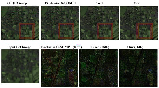 Finally, we provide the compared results with the pixel-wise G-SOMP+ method, the spectral representation with the fixed number, and the data guided number of the dictionary atoms on three real satellite images including the Hyperspec-VNIR Chikusei image, PaviaU image, and Salinas image. The compared quantitative results are manifested in Table 3. Table 3 also validates that our proposed method with the data guided sparsity could not only improve the performance, but also reduced the computational time compared with the pixel-wise G-SOMP+ method. The recovered HS images (the pseudo-color images with the 72nd, 76th, and 80th bands) and the absolute difference images with respect to the ground truth in an expanded region are visualized in Figure 8, which also manifests the smaller difference error in our proposed method with the data guided sparsity. The input HS images and the recovered HS images for Salinas and PaviaU data (the pseudo-color images with the 72nd, 76th, and 80th bands for Salinas data and the 22nd, 100th and 170th for PaviaU data) are given in Figure 9.