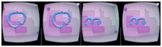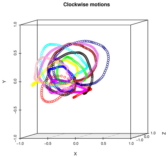 The phone of this model is equipped with an LSM6DS3 sensor manufactured by ST MICROELECTRONICS [51] with the full IMU functionality of 6-axis accelerometer and gyroscope. From technical point of view the LSM6DS3 sensor is a system-in-package featuring a 3D digital accelerometer and a 3D digital gyroscope performing at 1.25 mA (up to 1.6 kHz ODR) and able to work in different modes with linear acceleration measurement range of and angular rate measurement range of appropriately. The data was acquired using an Android OS JAVA application developed by us, which visualizes the head motion trajectory of the user wearing VHR in the form of colored balls that were displayed in a virtual three-dimensional room, see Figure 2, for example. This additional visual feedback helped experiment participants to visualize themselves and which head motion they performed. As can be seen in Figure 3, each experiment participant might perform the same action in many ways: although motions are similar to idealized trajectory the obtained spatial representations of motions are very diverse. Figure 4 presents real head motion trajectories obtained by one of the users. Compare this with Figure 1.