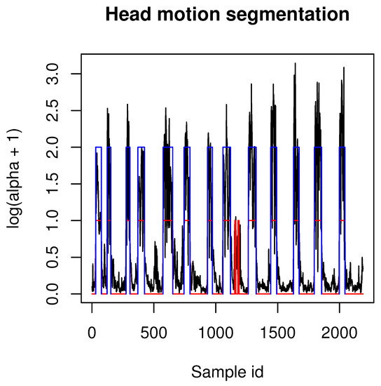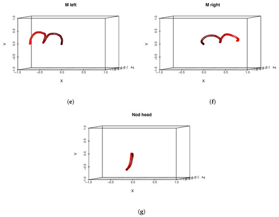 The majority of recordings that were acquired by our application contained multiple actions performed one after another by experiment participants. In order to segment motions recordings into samples that contain only one example of a certain gesture (as it is present in Figure 4 and summarized in Table 1) we have used a heuristic segmentation algorithm presented in pseudocode Algorithm 1. It can be seen that the algorithm is dependent on three adaptive parameters: median filter window size, angle difference threshold (in degrees) and minimal length threshold. Values of those samples might differ depending on the MoCap system acquisition frequency and in our case we used values: mk = 15, , . After applying our algorithm to those values, all motions samples were correctly segmented from our MoCap data. After segmentation head gestures were manually labeled in order to assign them to correct classes. Example segmentation results are presented in Figure 5. We decided to use our own segmentation method because it have returned anticipated results; however, one can use any method proposed in the literature, for example, [34]; however, some tuning of those methods (for example, adaptation to acquisition frequency) might be unavoidable. Those issues, however, are beyond the scope of this paper.