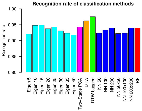 Generally, PCA-based time series processing is used either for dimensionality reduction before a signal is classified by a pattern recognition algorithm or another type of analyses. This is done because in many cases distance-based classifiers perform better in lower dimensional space. The choice of following pattern recognition method or analysis procedure depends on what the goal authors wanted to obtain. In the case of classification, authors use, for example, HMM [23], DTW [24], nearest neighbors [25,26,27], and SVM [28]. Authors also perform various types of analysis for example aligning signals with Two Step Aligning algorithm [29], drawing direct conclusions from principal components [30,31,32,33] or data segmentation [34]. The second application of PCA is for generating motion features of fixed size that are vector of real values which represents features of linear combination of eigenvectors that can be also classified by general-purpose classifiers like, for example, SVM [35,36,37] or nearest neighbors [38]. The classification effectiveness depends mostly on type of activity authors wanted to recognize the quality and variability of data. There are also some methods that utilize both dimensionality reduction and Eigen-based features to perform motion classification, for example, [39].