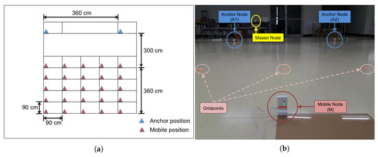 (a) Experiment layout: on the floor of an indoor hall, two anchor nodes are located at fixed positions and a mobile node is placed at reference gridpoints in a square grid. (b) Experiment environment.