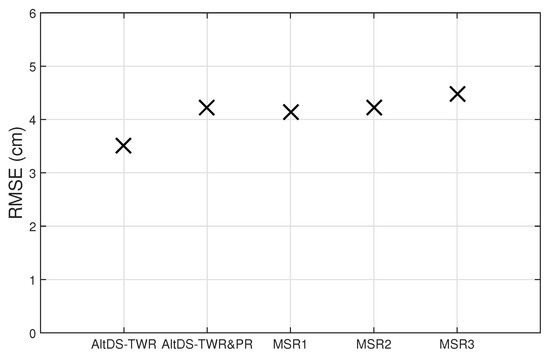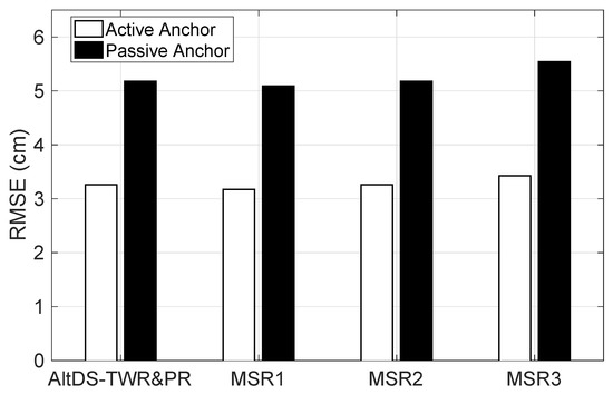Figure 3 plots the RMSE versus type of involved anchor node, active or passive, for AltDS-TWR&PR, MSR1, MSR2, and MSR3. Note that according to Equation (36), the RMSE of estimated TOF is for the active anchor node or for the passive anchor node. In this regard, the RMSE of estimated range for the passive anchor node A2 should be times higher than that for the active anchor node A1. This relation is consistent with the results in Figure 3, where the RMSEs of estimated range for the passive anchor node for all the considered schemes are approximately two-fifth higher than that for the active anchor node. Nonetheless, the RMSEs are of the same order of magnitude, below very few centimeters.