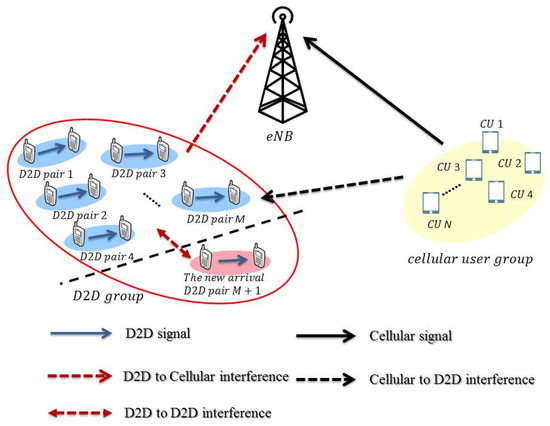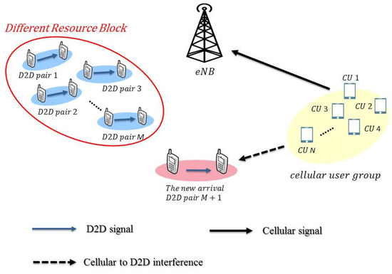 The system illustration with multiple cellular users and device-to-device (D2D) users coexisting in the underlay mode.