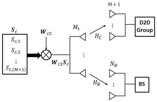 We can extend the multiuser SLNR-based precoding obtained in (10) to a multi-stream precoder for the cellular users . All the cooperating cellular users can be considered as a virtual single user but with multi-stream and the group of D2D pairs and BS are viewed as two receivers. The block diagram for multi-stream precoding is illustrated in Figure 3, where specifies the complex Gaussian channel coefficients between the cellular users and the BS. Then, the SLNR for cellular users is