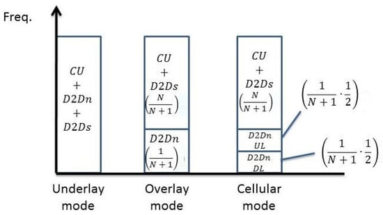 where with the abbreviations within the set clearly standing for the underlay, overlay, and cellular mode, respectively.