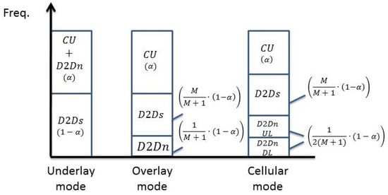 On the other hand, for the existing D2D pairs being in the overlay mode, the spectrum allocation for all users in the cell is illustrated in Figure 5, where denotes the proportion of spectrum used by cellular users, . In the simulation, we will compare the result with different values of . When the new D2D pair coexists in the underlay fashion, it shares the spectrum with the cellular users non-orthogonally whereas the other existing D2D pairs take up the remaining part of the resources. When the new D2D pair coexists in the overlay mode, cellular users, the current active D2D pairs and a new pair of D2D users use the spectrum orthogonally so that no interference is present. When the new D2D pair is in the cellular mode, spectrum allocation is the same as the overlay mode but half of the spectrum allocated for new D2D pair is for the uplink and the other part is for the downlink.