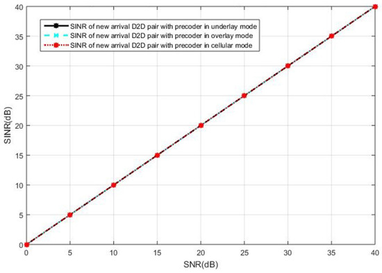 We first present the simulations results when the current active D2D users operate in the underlay mode. The SINR observed at the intended receiver in the new pair of D2D users is shown in Figure 6, when the cellular users cooperatively employ BD precoding and the D2D users cooperatively employ the ZF precoding. It can be seen in Figure 6 that the interference toward the new D2D user is completely eliminated, as the SINR is equal to SNR in all curves, by the BD precoding in the cellular users and the ZF precoding in the D2D users. In this case, we see the same performance for the three selection modes. However, the ZF precoding suffers from the limitation of antenna constraints, as discussed in Section 3.
