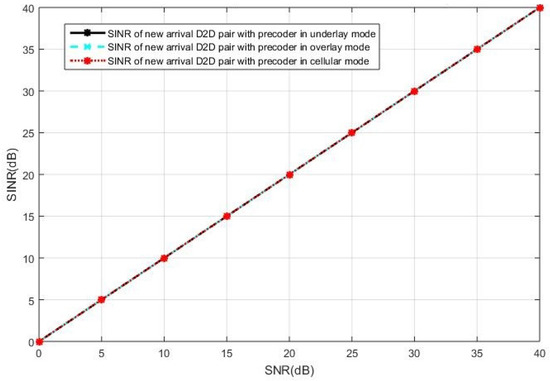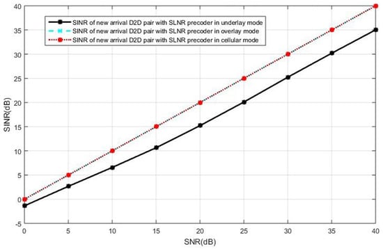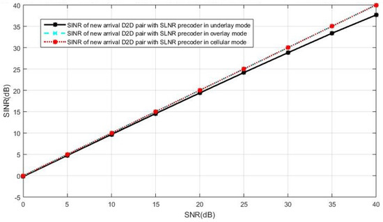 The SINR observed at the new D2D receiver is shown in Figure 7 when both the cellular users and the D2D users employ the SLNR precoding, which poses no constraints on the number of antennas. In Figure 7, we see the intended user of the new D2D pair in the underlay mode receives less SINR than that in the cellular or overlay mode. This is because the SLNR precoding cannot completely remove the interference in the case of the new D2D receiver operating in the underlay mode, in which the interference impacts on the SINR due to non-orthogonal resources reuse while the new D2D user suffers no interference in the overlay and the cellular mode. In this case, the overlay mode and the cellular mode are the better options compared with the underlay mode.