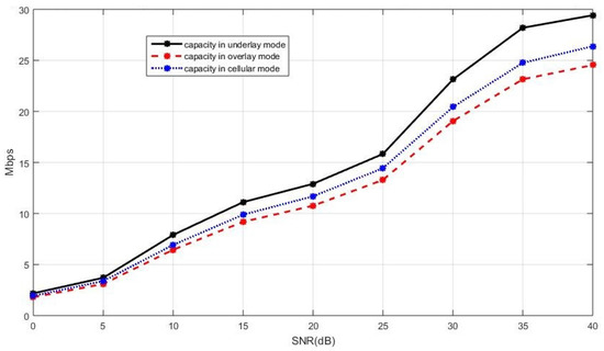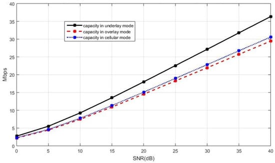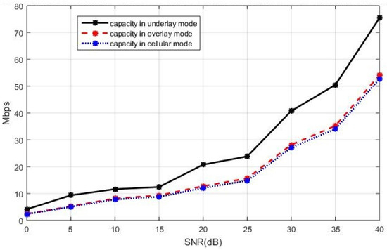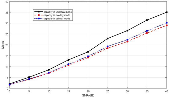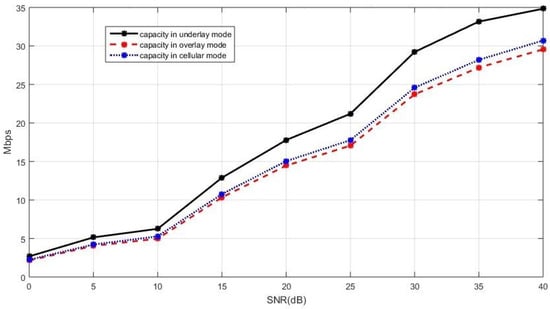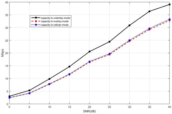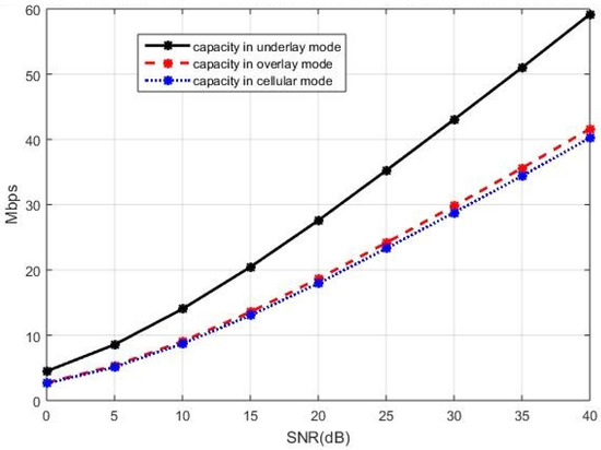 - The sum capacity when the new D2D paper is in the underlay mode is given bywhere denotes the capacity of BS and is the SINR of BS. The interference in comes from the new D2D pair.