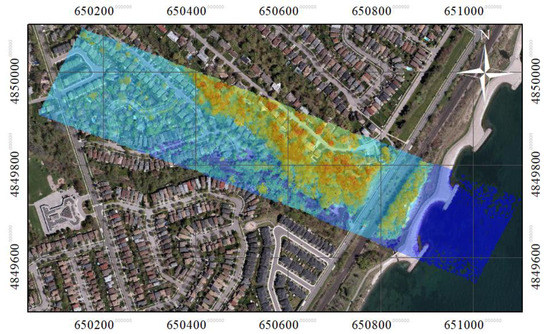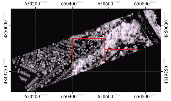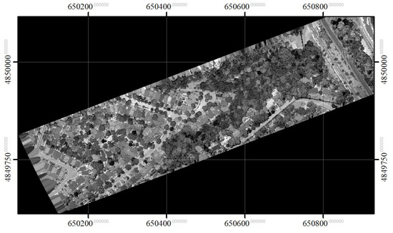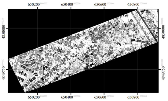 The dataset used in this study was acquired in September 2014 from a Titan multispectral sensor (Teledyne Optech, Concord, ON, Canada), operating at three wavelengths: 1550 nm (Channel 1), 1064 nm (Channel 2), and 532 nm (Channel 3), and mounted on an aircraft. The three channels were collected at different viewing angles: 1550 nm at 3.5° forward-looking, 1064 nm at 0° nadir-looking, and 532 nm at 7° forward-looking. Three separate data clouds were generated, and their point densities were slightly different but around 45 pts/m2 for individual data clouds. The three point clouds in the Titan dataset were co-registered by generating a reference grid. The reference grid was formed using channel 1 (1550 nm). Even though channel 1 was used to generate the reference grid, it was observed that the selection of a different channel did not affect the spatial resolution of the grid or the quality of interpolation. The datasets were collected in a study area located in the south-eastern region of Toronto, ON, Canada. The point cloud in channel 1 is overlaid with an aerial image in Figure 1. As shown in the figure, the scene consists of isolated trees located in urban zones (to the northwest) and dense tree clusters in woodlots (to the southeast). The tree crowns are dominantly deciduous. During the data acquisition, the deciduous trees were with leaves on and mainly green.