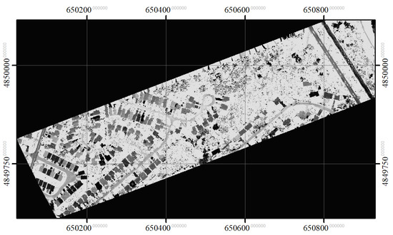 The intensities recorded for the three channels were first normalized with respect to range [27]. A digital surface model (DSM) and intensity image for each channel were generated by rasterizing the first returns. The spatial resolution of the raster images was 0.25 × 0.25 m based on the average distance between pulses [21]. To generate the DSM and intensity image, the maximum height value and its corresponding intensities were used for each cell with first-return LiDAR points, and any empty cell was filled by interpolating the values of non-zero neighbour cells using inverse distance weighted interpolation [28,29]. The CHM image was created based on the difference between the DSM and a digital elevation model (DEM), which was generated using a progressive TIN densification algorithm (Axelsson [30]). The CHM was then smoothed with a 3 × 3 Gaussian low-pass filter to eliminate noise, as done by Hyyppä et al. [28] and Morsdorf et al. [31]. The three CHMs generated for the three channels were similar, and, as a result, the CHM for channel 1 (1550 nm) was used to obtain height information about individual crowns. The three intensity images were used to obtain spectral information about the tree crowns. Figure 2, Figure 3, Figure 4, and Figure 5 show the generated CHM and three intensities images, respectively.